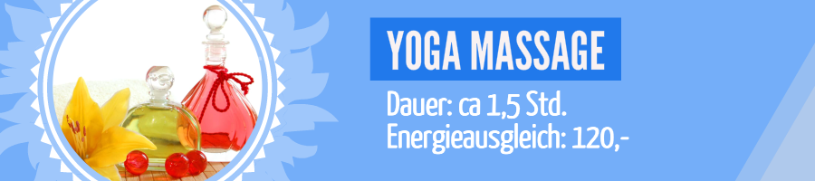 Die Yoga Massage ist eine besonders kraftvolle Ganzkörper-Massage, die einen Ausgleich der Yin- und Yang-Kräfte in Deinem Körper bewirkt, die Chakren befreit, Muskeln und Sehnen lockert und die Energien in Deinem Körper wieder frei fließen lässt.
